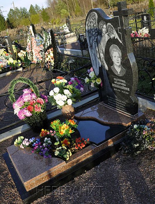 Многоуровневая фигурная плита на могилу из контрастного по цвету натурального гранита. Внутренние края плит – сегментов обработаны в виде плавной волны. Плиты расположены на разной высоте. Конструкция выглядит оригинальной и визуально легкой.