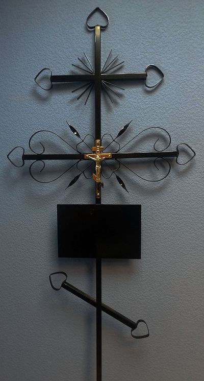 Металлический крест с витыми декоративными элементами. Окрашен специальным составом, защищающим изделие от коррозии. Имеется место для размещения таблички с указанием фамилии, имени, отчества усопшего.