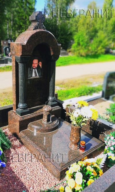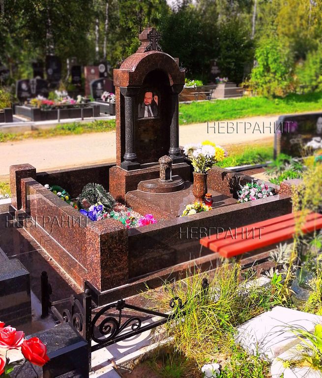Грандиозный надгробный комплекс в виде широкой арки. Элитное основательное надгробие с колоннами и небольшим крестом, венчающим композицию. Изготовлен памятник из строгого черного и экстравагантного ярко-красного гранитов. Дополняет композицию глухая монолитная двухуровневая фигурная надгробная плита с лампадой и вазой.