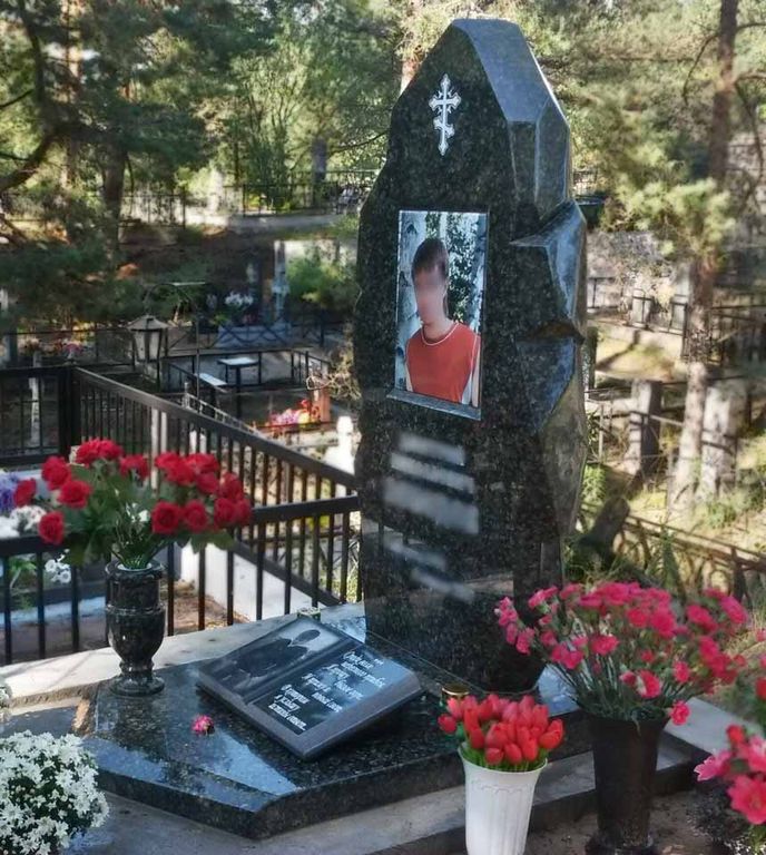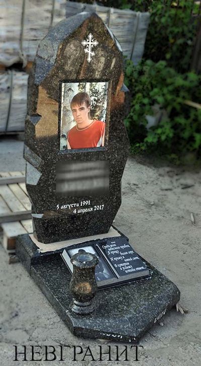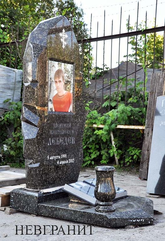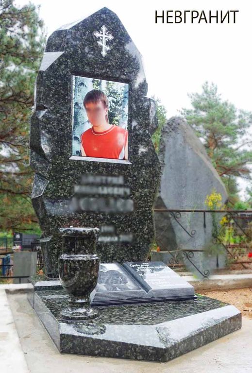 Монументальный надгробный памятник из редкого зеленого гранита. Массивное и респектабельное надгробие уравновешивает тяжелая надгробная плита неправильной формы. Заключительным аккордом является высокая ваза.