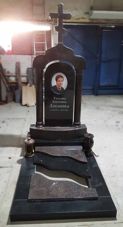 Элитный памятник в виде строгой арки, увенчанной православным крестом. Роскошный надгробный комплекс дополняет каскад надгробных плит контрастного цвета. Яркие декоративные элементы – ваза и лампада – делают композицию законченной.