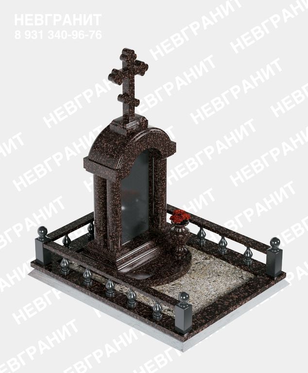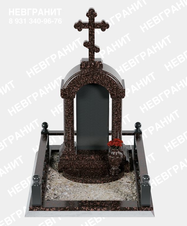 Элитный памятник в виде строгой арки, увенчанной православным крестом. Роскошный надгробный комплекс по периметру дополнен бордюром с балясинами. Надгробная плита выполнена в виде полусферы. Классическая ваза завершает композицию.