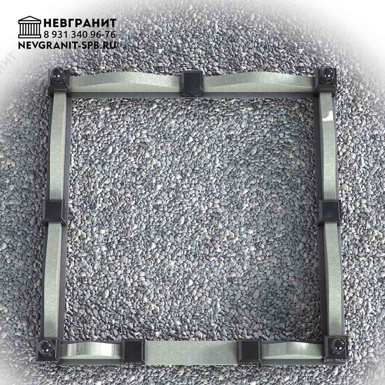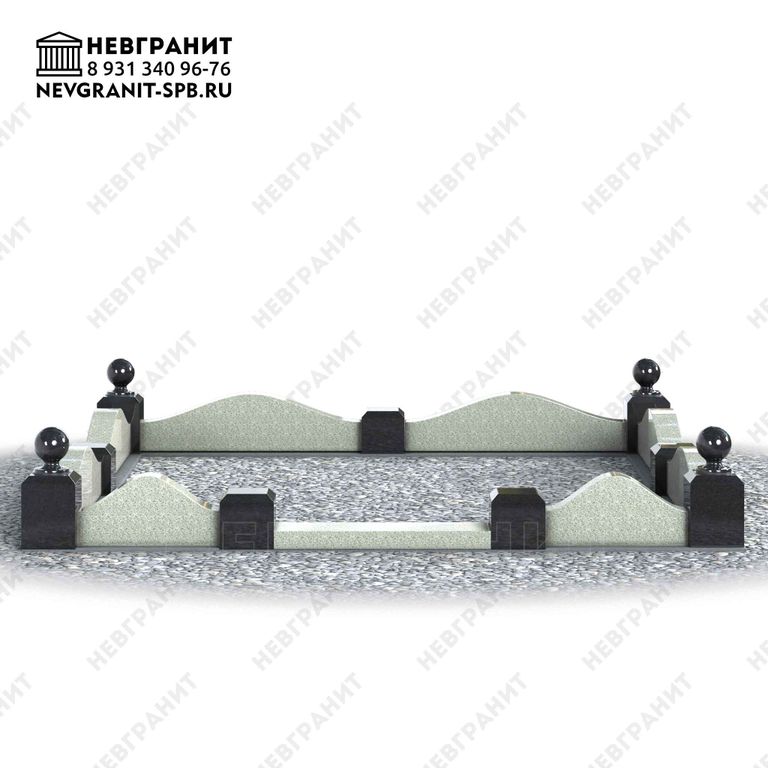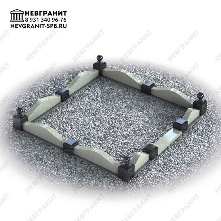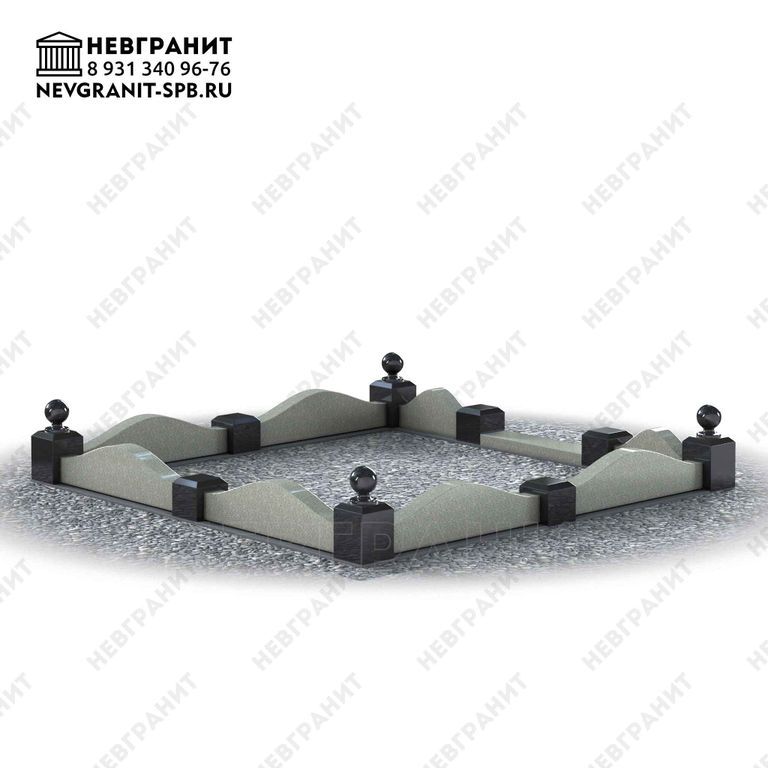 4 гп. Фигурный поребрик из натурального гранита на могилу. Изящная плавная вырезка в виде волны и декоративные столбики с навершием в виде шаров по углам. Указанный размер 2 м на 2 м является ориентировочным и может быть изменен по согласованию с заказчиком с учетом размеров конкретного участка могилы.