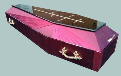 Комбинированный деревянный гроб с отделкой из шелковой ткани пурпурного цвета. Уникальные дизайнерские ручки и прочные замки. На поверхности лакированной крышки выгравирован большой православный крест, выполненный в «золотом» цвете.