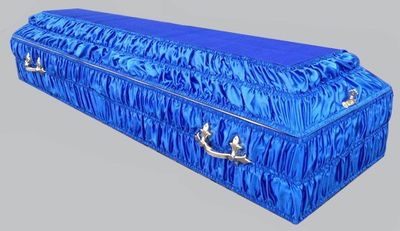 Деревянный гроб, полностью задрапированный ярко-синей тканью. Фурнитура и защелки фигурные, выполнены из хромированного металла. Цена 7500 рублей.