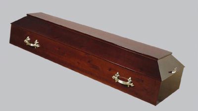 Лакированный деревянный гроб, покрытый матовым лаком. Классическая, лаконичная форма. Защелки и ручки изготовлены из материала «под бронзу». Цена 23 000 рублей.