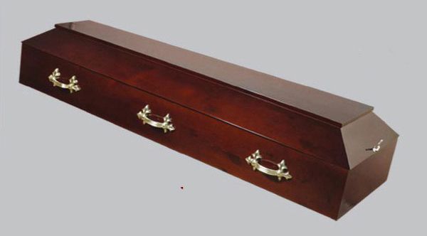 Лакированный деревянный гроб, покрытый матовым лаком. Классическая, лаконичная форма. Защелки и ручки изготовлены из материала «под бронзу». Цена 23000 рублей.