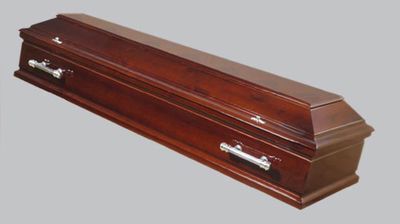 Лакированный деревянный гроб, покрытый матовым лаком. Классическая, лаконичная форма. Защелки и ручки изготовлены из материала «под бронзу». Цена 29000 рублей.