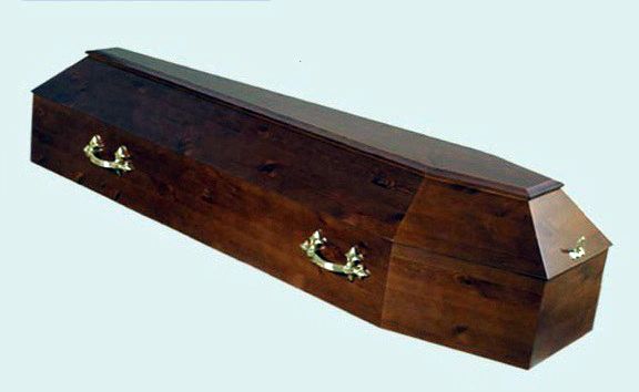 Лакированный деревянный гроб, покрытый матовым лаком. Классическая, лаконичная форма. Защелки и ручки изготовлены из материала «под бронзу». Цена21500 рублей.