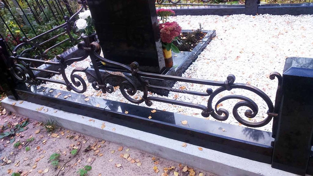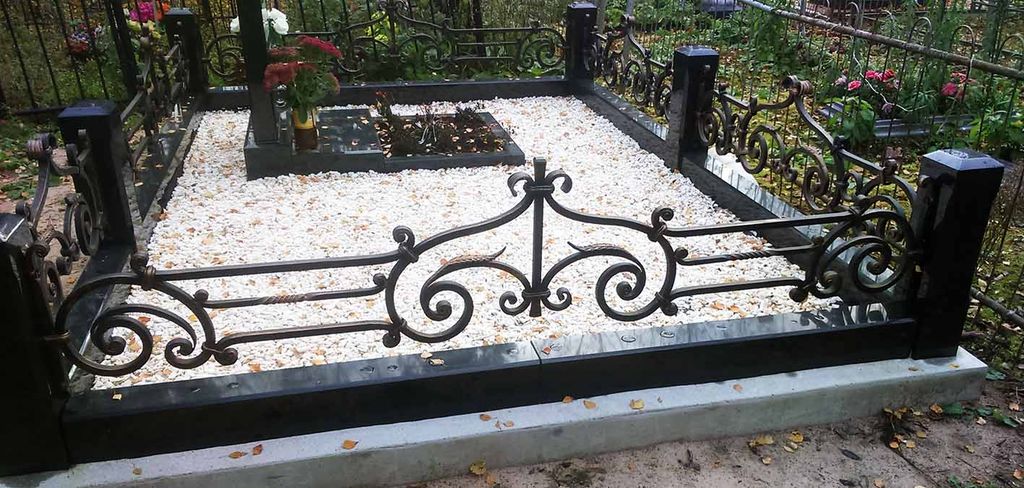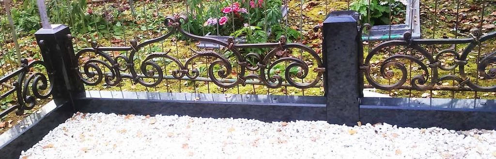 3 гк. Поребрик гранитный комбинированный с металлической дизайнерской решеткой. Решетка потрясающе красива, создана по авторскому проекту. Конструкция надежна, выглядит необычно, современно и стильно. Металлические сегменты закреплены по периметру участка с помощью гранитных столбиков. Указанный размер 2 м на 2 м является ориентировочным и может быть изменен по согласованию с заказчиком с учетом размеров конкретного участка могилы.