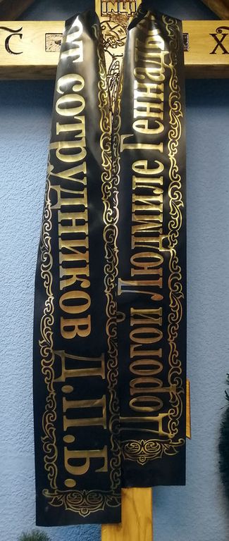Широкая атласная лента на погребальный траурный венок. Цвет черный или бордовый по выбору. Возможность нанесения методом фотопечати золотой краской любой надписи по желанию заказчика.
