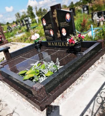 Площадь участка полностью покрыта каменными полированными гранитными плитами. По периметру установлен цельный поребрик, дополненный столбиками с широкой фаской по углам. Декоративными и одновременно функциональными элементами являются гранитные вазы и скамьяВАЗА ГРАНИТНАЯ НА МОГИЛУ.