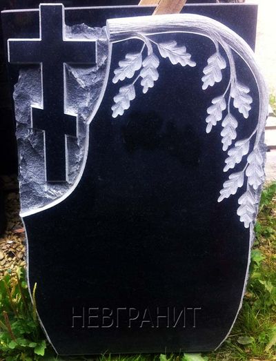 Памятник-скала из черно-серого гранита габбро-диабаз. Стела дополнена декоративным резным элементом в виде дубовой ветви и врубным православным крестом.