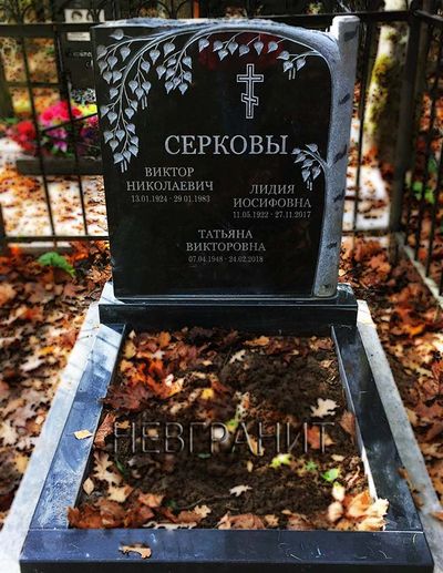 Уникальный вертикальный памятник-скала из черно-серого гранита габбро-диабаз. Керамическая прямоугольная вставка с цветным портретом точно вписана в большую художественную картину, расположенную на лицевой поверхности стелы методом гравировки. Отбивка по верхнему краю повторяет очертания облаков, изображенных на картине.