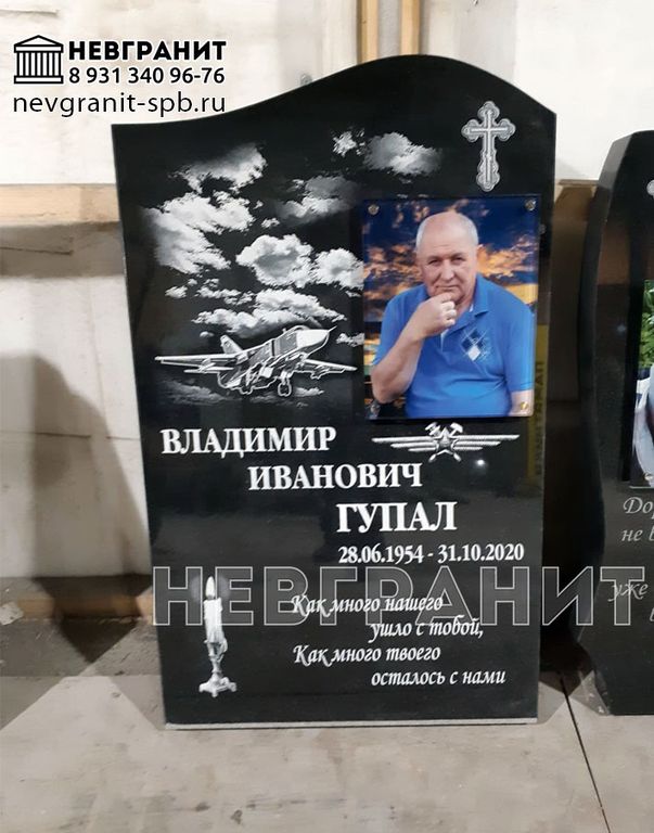 Гранитный памятник для военного. Картина гравировка с самолетом. Портрет на стекле.