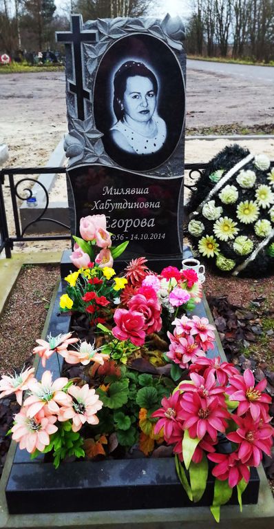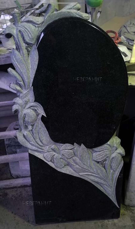 Фигурный резной гранитный памятник с крестом и овалом, предназначенным для размещения портрета. Особенностью памятника считаются шикарные розы, вырезанные вручную на камне и изящно обрамляющие портрет. Стела выглядит неординарной и утонченной, благодаря гармоничному сочетанию цветов и креста.